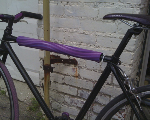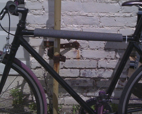 If you ride a bike in the city you have to lock it up. And finding something to lock it up to isn’t always easy. It can be a tree, a fence, a street sign or occasionally an actual bike rack. Attaching your bike to all of that stuff tends to lead to scratches…hence, the top tube protector. I admit, mine is really just because I like to be able to change the colors around a little but it really does protect it. Copper pipe insulation is the perfect padding, and the quilting scraps from a fabric store give you just the right amount of fabric. Mine have velcro across the bottom but I’ve heard of people making them with zippers too!